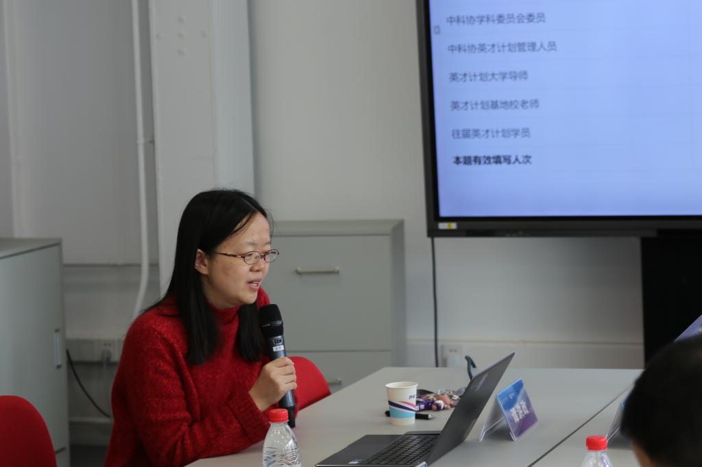 居重艳老师汇报了《英才计划调查问卷及半结构化访谈提纲》,通过一系列数据分析解读了创新人才识别与选拔的反馈意见。
