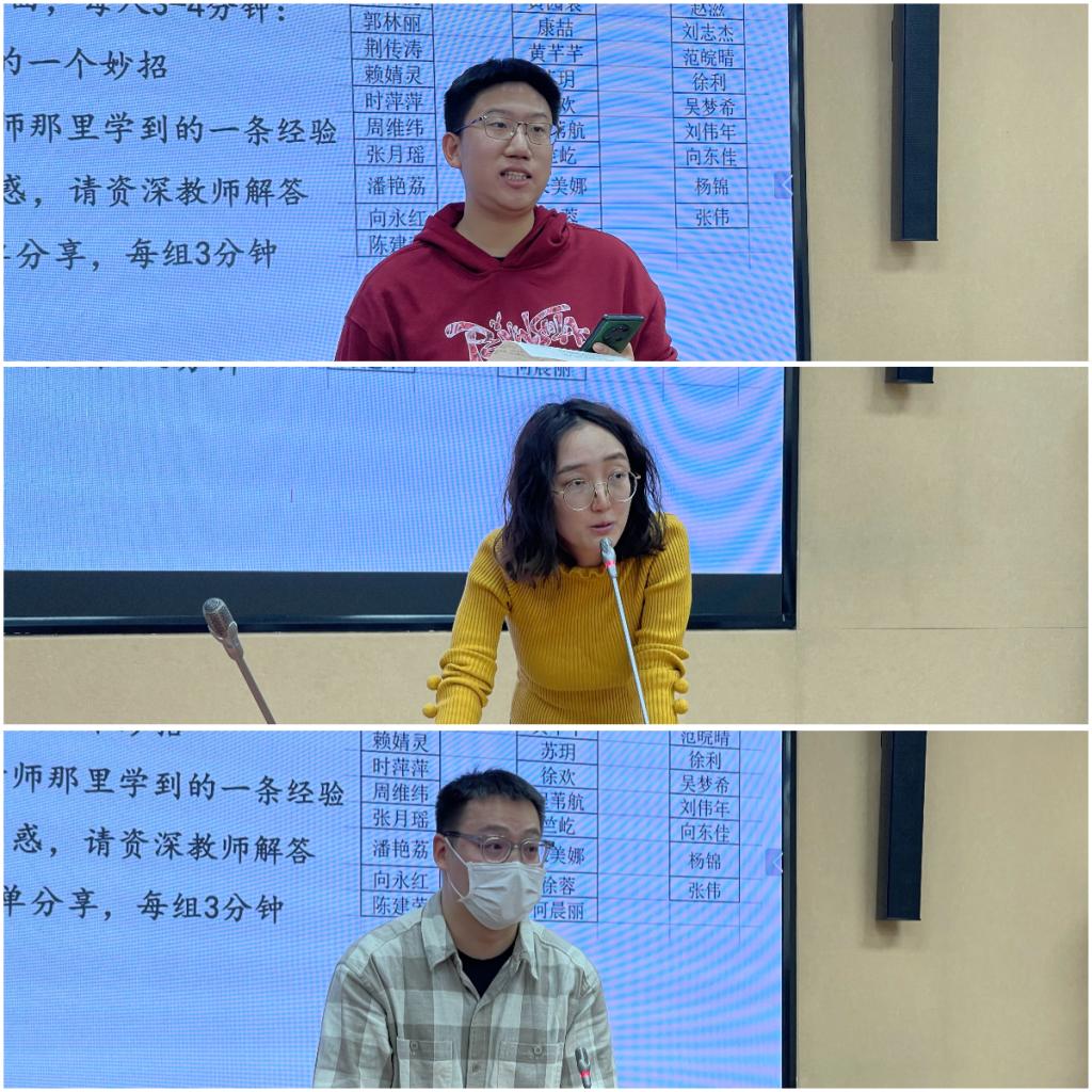 接下来,初21学部全体青年教师、成长顾问和班主任师父分为三组,青年教师就教育教学中的小妙招、从师父和其他老师处学到的经验和自己工作中的困惑三个方面展开分享,请资深教师进行解答。