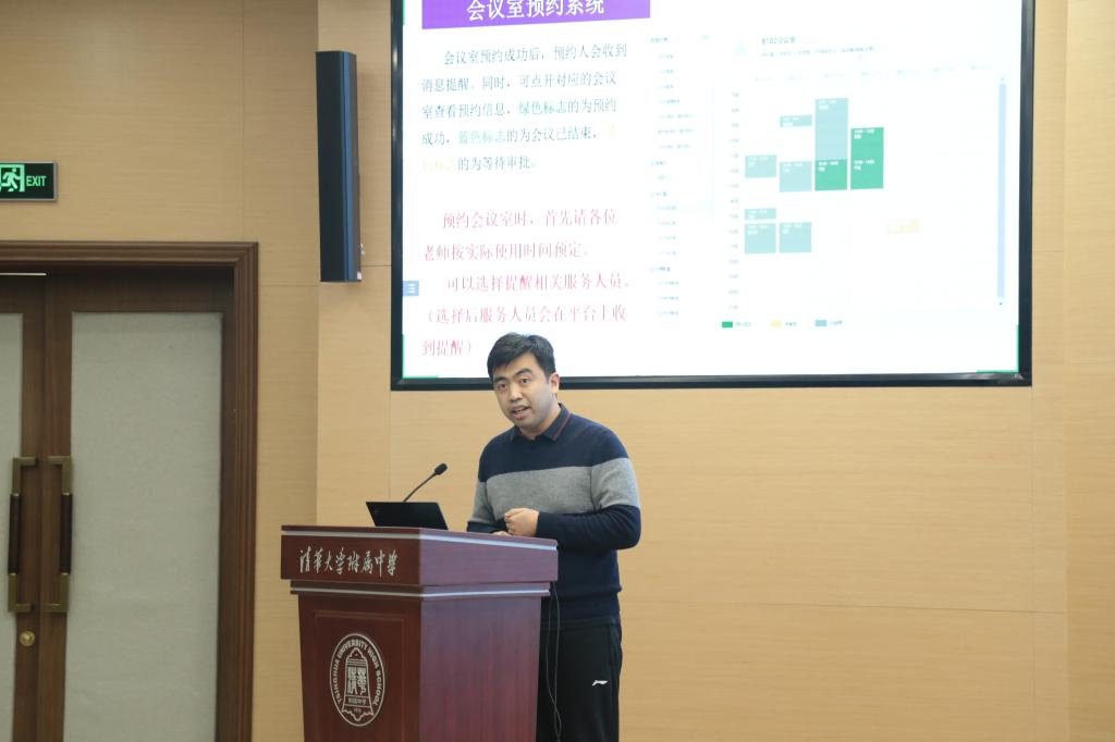 网络中心段晨老师首先从智慧校园登录、居家办公VPN使用、智慧校园电脑端平台使用及重要功能应用、如何加入学校企业微信等方面进行了细致的讲解;随后咸月辉老师介绍了模块成绩管理、学情分析的使用说明。参会的教师认真学习,并对平台运用中碰到的疑问与网络中心的老师进行了深入的互动交流。