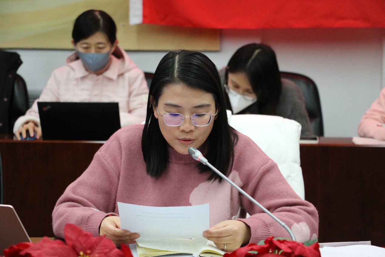 组织委员迟旭同志汇报了群众调查结果。群调中,老师们表示靳姝菲同志具备较好的专业功底和教学能力,自到附中工作以来,受到学生喜欢和认可,对靳姝菲同志的表现予以充分肯定。