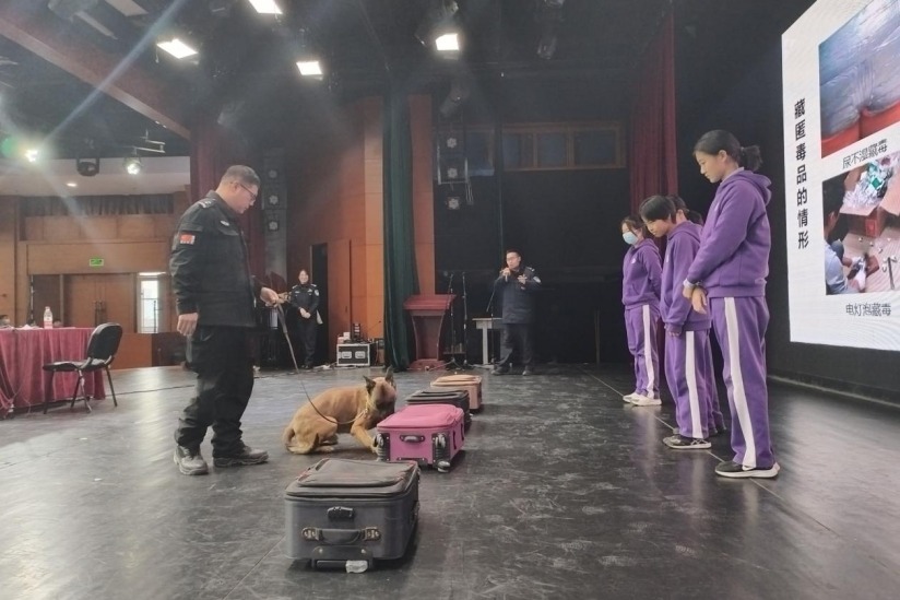 缉毒犬成功找出藏匿毒品的箱子,同学们与禁毒民警、缉毒犬共同完成本次“缉毒”