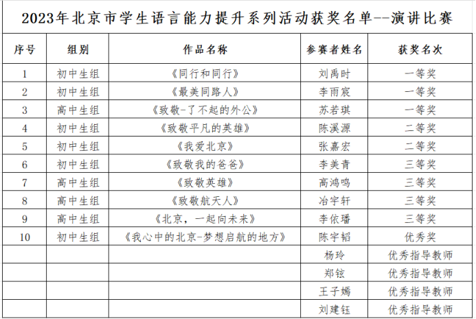 为提高学生的思维品质、语言素养和语言能力,拓宽学生的视野,积累赛事经验,不断深入弘扬中华优秀语言文化,推进文化自信自强,彰显时代精神,为实现中华民族伟大复兴凝聚磅礴力量,北京市教委、语委办举办北京市中小学生演讲比赛和辩论赛。澳门博彩在线各年级学生积极参与、认真准备,在比赛中喜获佳绩,其中刘禹时、李雨宸、苏若琪、张怀予、殷瑞宁五位同学荣获一等奖,陈溪源、张嘉宏、凌筱、陈曦晴四位同学荣获二等奖,李美青、高鸿鸣、冶宇轩、李依璠四位同学荣获三等奖,陈宇韬同学荣获优秀奖,澳门博彩在线教师杨玲、郑铉、王子嫣、刘建钰、那妮五位教师荣获优秀指导教师奖。