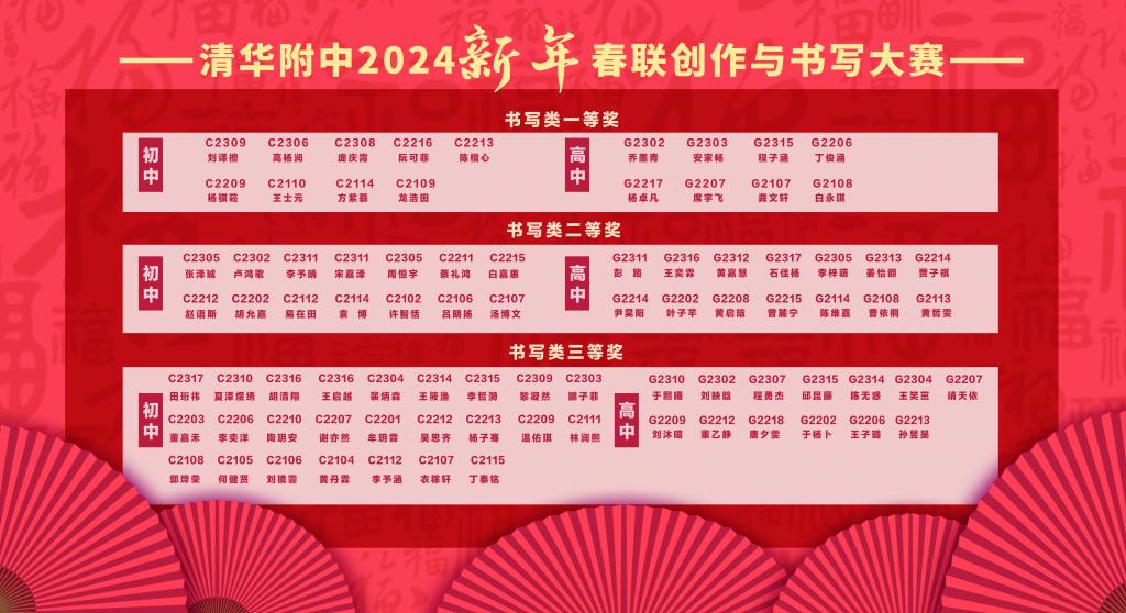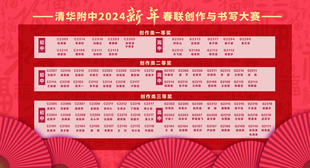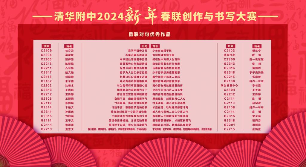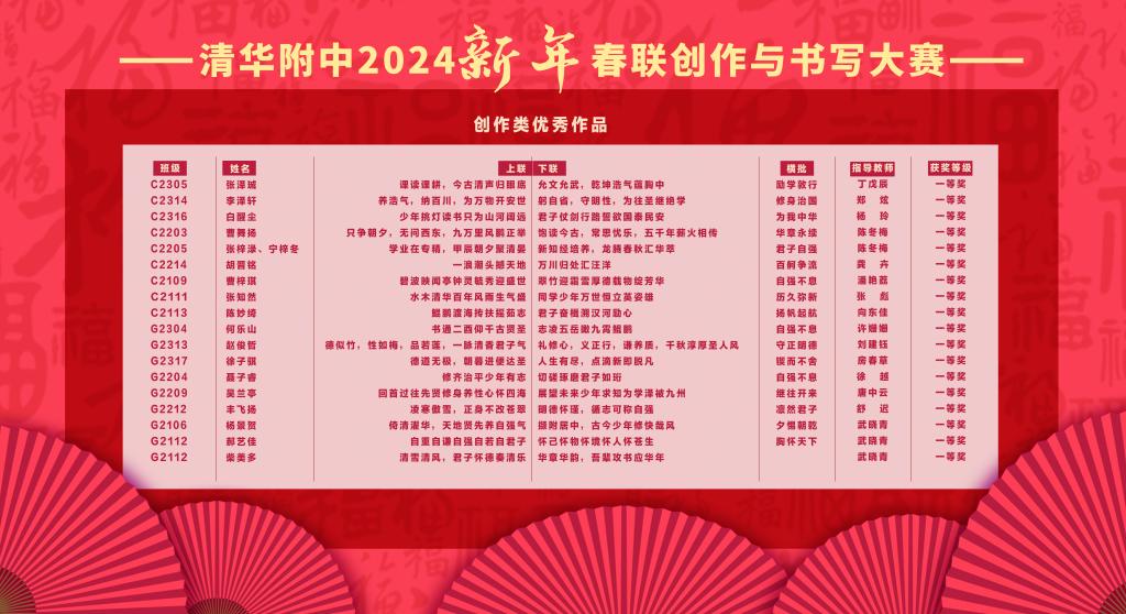 本次春联大赛的创作阶段,每班选送两幅春联参加评选,经语文教研组研讨后,评审出创作类一等奖18位,二等奖29位,三等奖48位。诗以言志,“少年挑灯读书只为山河阔远,君子仗剑行路誓欲国泰民安”、“鲲鹏渡海抟扶摇茹志 君子奋楫溯汉河励心”,一幅幅包含深情的创作承载着附中学子对新春的祝福、对志向的追求以及对祖国的赤子情怀。