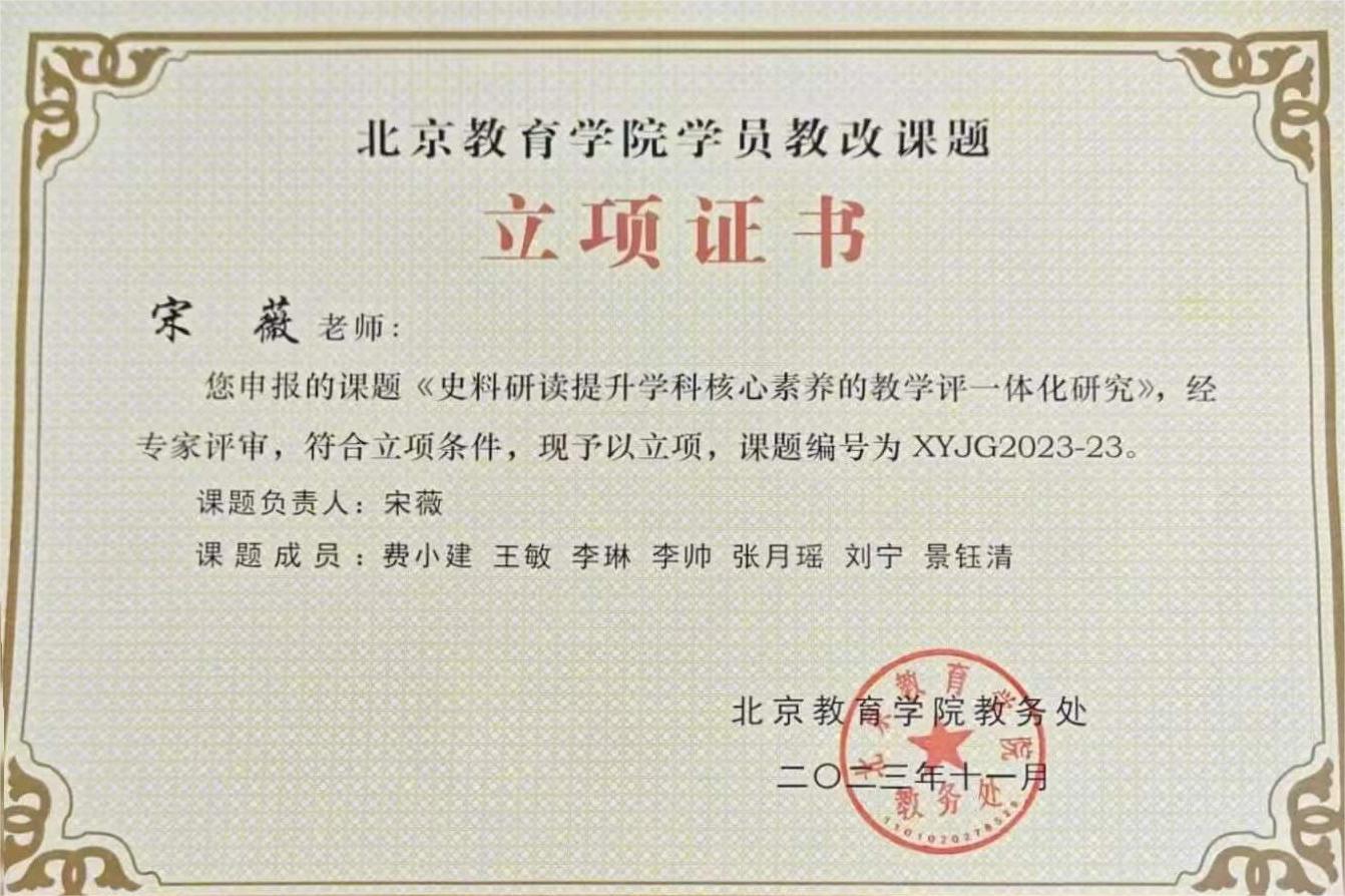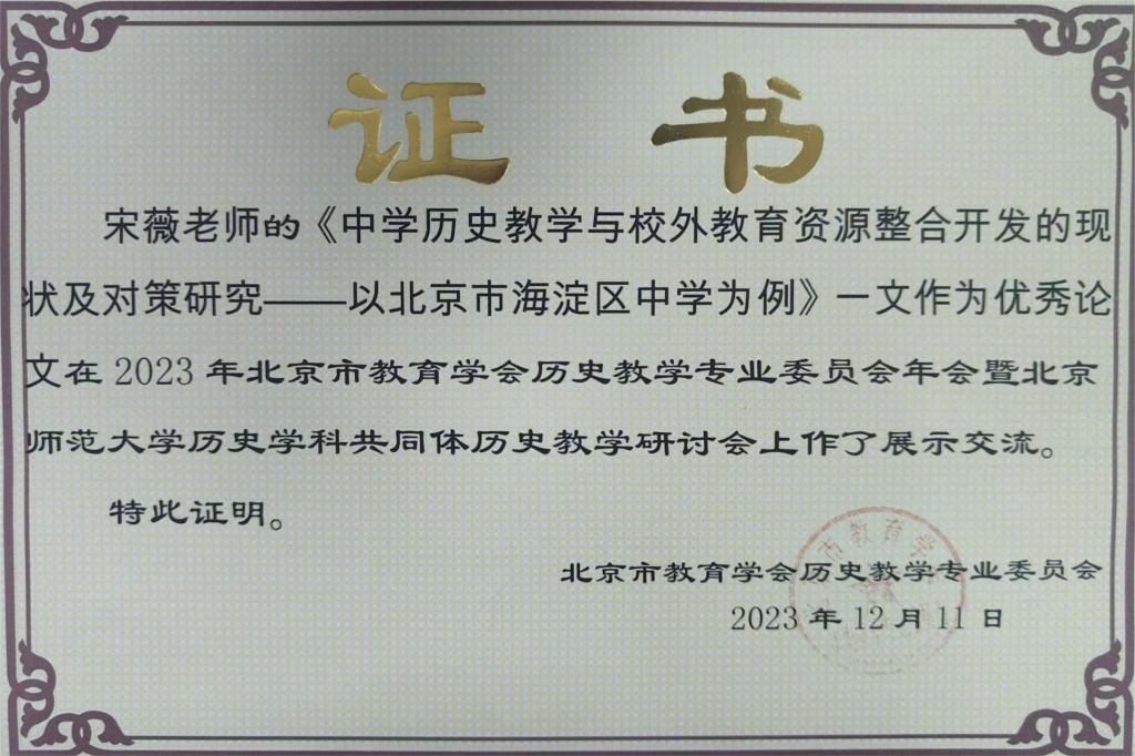 除了著作出版和课题立项外,历史教研组教师在论文获奖和发表方面也成果颇丰。宋薇老师的论文《中学历史教学与校外教育资源整合开发的现状及对策研究——以北京市海淀区中学为例》、景钰清老师的论文《“北华捷报”中不同在华外国人对禁烟运动的态度》作为优秀论文在北京市教育学会历史教学专业委员会年会暨北京师范大学历史学科共同体历史教学研讨会上作了展示交流。