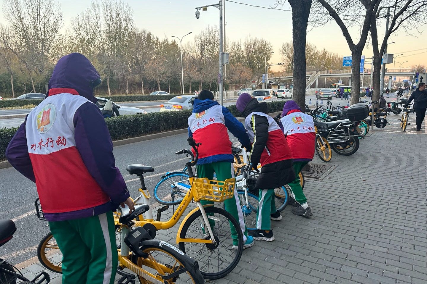 志愿者在摆放自行车