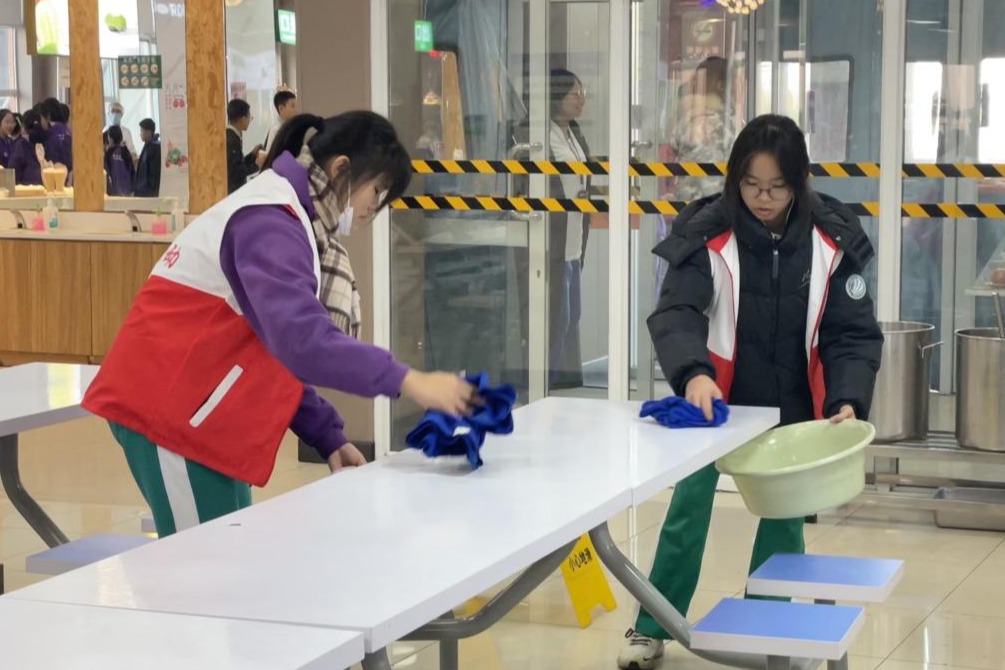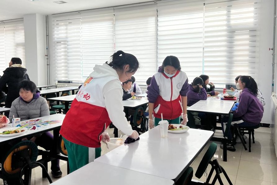 志愿者们在认真擦拭餐桌