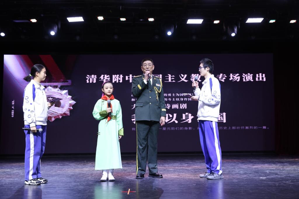 初三6班聂卓然(学生演员) :《我愿以身许国》这部音乐诗话剧制作精美、内容丰富,让我对“两弹一星”元勋的故事有了更深刻的了解,使我对科研人员产生了由衷敬意。这部剧的成功离不开各位台前幕后各位老师和工作人员的辛勤付出,尤其感谢各位敬业的话剧老师给予我们小演员的专业指导,使我对话剧表演产生了浓厚的兴趣。最后,特别感谢学校和各位老师给我们这次宝贵的表演机会,我一定会学习并传承“两弹一星”精神,努力学习奋斗,将来倾尽全力,报效祖国!