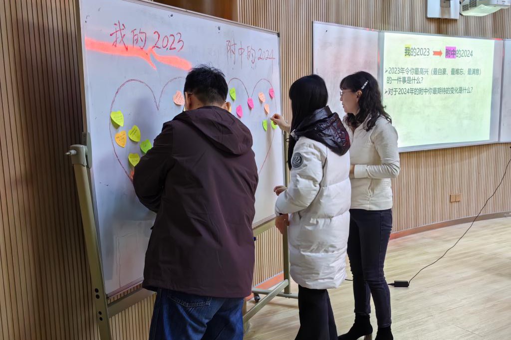 各支部还结合自身特点,开展了富有特色的支部活动。政治历史地理教研组党支部开展了“我的年度汉字”活动。老师们结合支部党建与生活工作的体验展开热烈讨论,用“望”“新”“坚”等汉字,表达了在新一年投身附中高质量发展的决心和干劲。英语教研组党支部组织全体党员共同写下2023年令自己最难忘的一件事以及对于2024年附中发展的展望,大家共同分享“心愿”,表达了对附中的美好祝福。