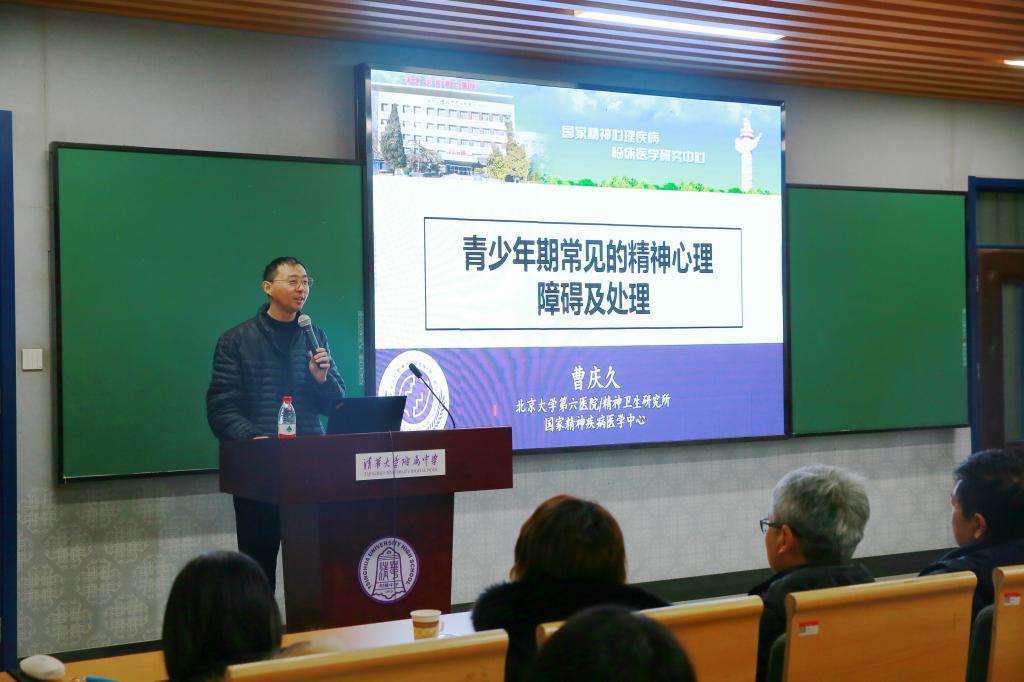 在讲座中,曹庆久教授向老师们呈现了当今国内外关于儿童青少年心理及行为问题的流行调查情况,逐年增加的患病率引发了老师们的深思。曹教授从青少年自身因素、家庭、同伴、人口学、学校及社区等方面分析了影响青少年心理健康的因素,指导教师们如何从横向和纵向对学生的日常行为表现进行细心观察,发现可能存在的精神心理问题,从而将危机预防工作前移。