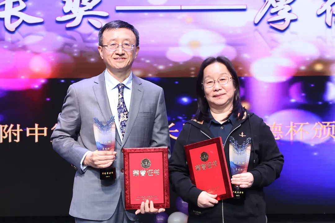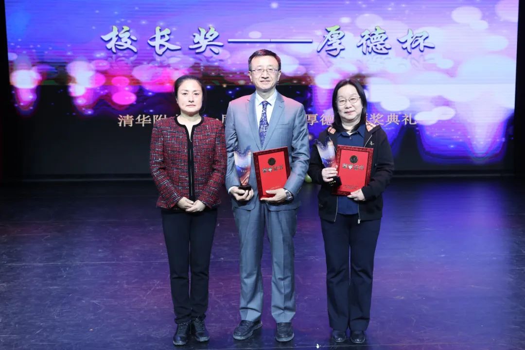 在前期全校海提的基础上,经全体教职工民主投票选举,尹粉玉、刘桂章两位老师脱颖而出,最终荣获首届“校长奖——厚德杯”。方妍校长为两位榜样模范老师颁发荣誉证书和纪念奖杯。