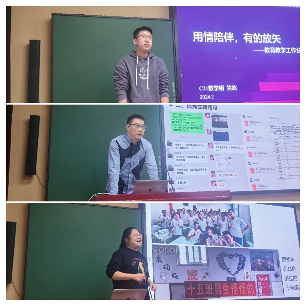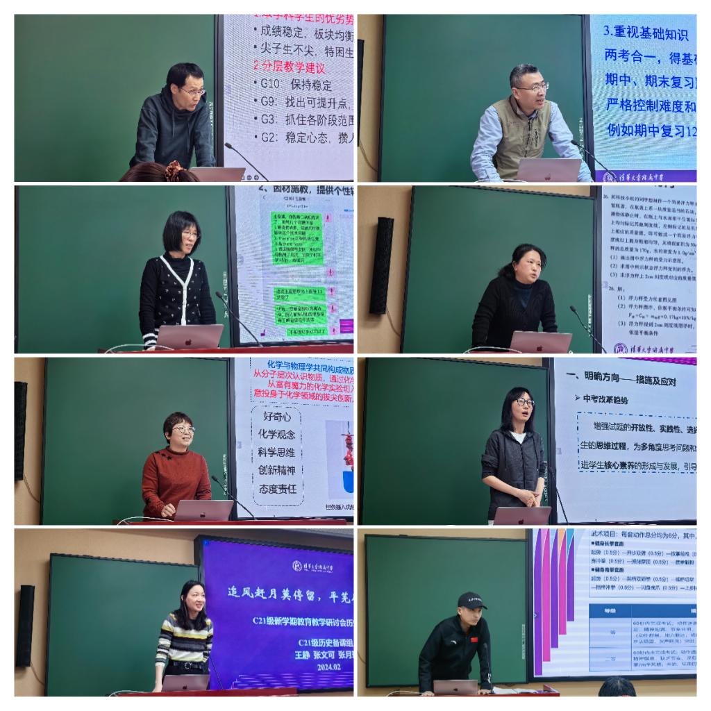 24日上午,初21学部进行备课组和班主任工作汇报。语文备课组长张伟聚焦本学科学生的优势劣势,分别给出教学建议。数学备课组长向永红将“深度”贯穿到集体备课、教学策略等方面,落实集体备课主备人制度。英语备课组长曹佩总结了信息技术赋能英语教学的有效措施,细致地规划了分层课后服务。物理备课组长杨桦规划了物理学科各部分的教学安排,着力提升学生获得感,精准施策,落实到人。化学备课组长白建娥强调,初中化学教学要坚持长久兴趣和科学思维的培养,不能只看刷题和“套路”,要举一反三、勇于质疑。道德与法治备课组长黎颖从解题、答题能力的角度分享了学生提高的“痛点”,要“全面”“重点”两手抓。历史备课组长王静介绍了历史组重新设计单元教学的规划,用“新”设计,向“新”前行。体育备课组长荆传涛总结了初三体育教学行之有效的做法,按照项目罗列出目前预计未满分人数,制定策略进行重点突击。