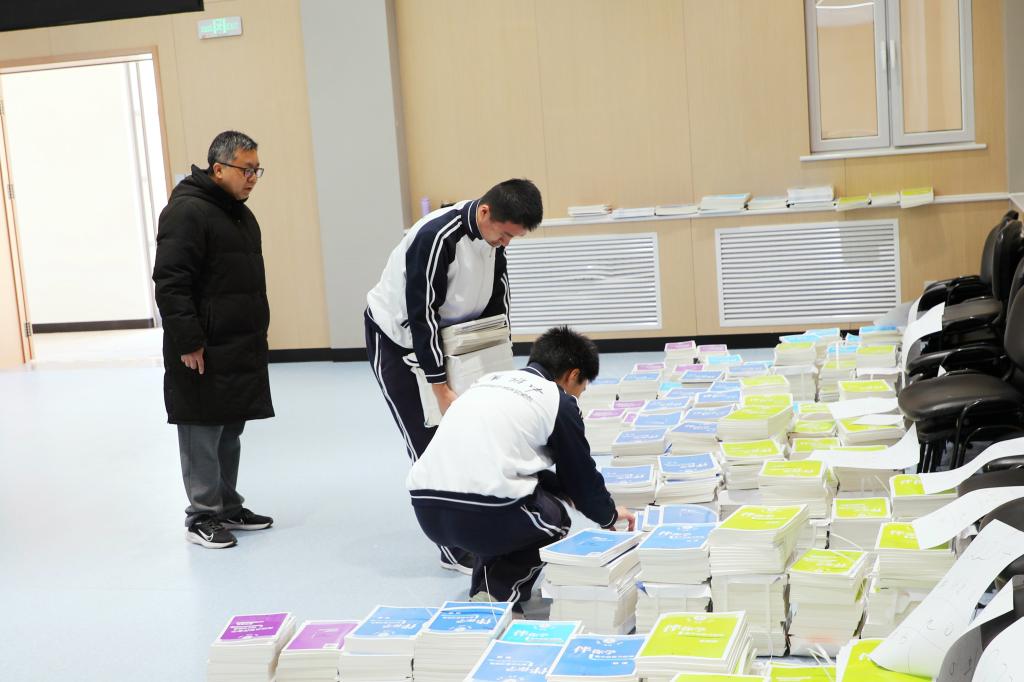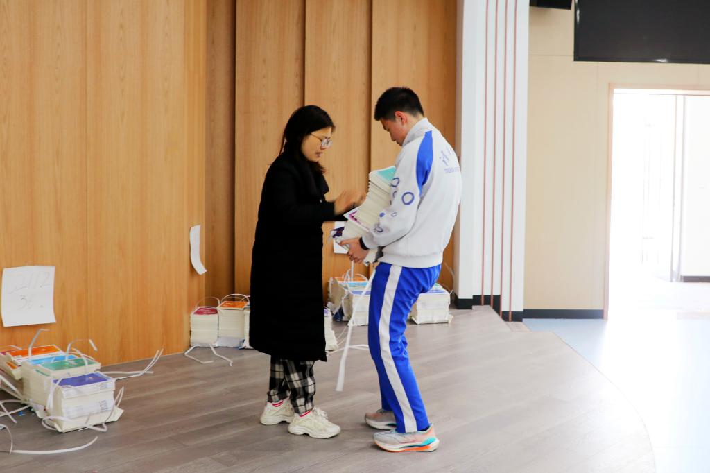 澳门网上博彩图书馆的负责老师提前将教材分类码放,方便学生领取。各班学生志愿者提前来到学校为班级服务,领取教材并依次发放。