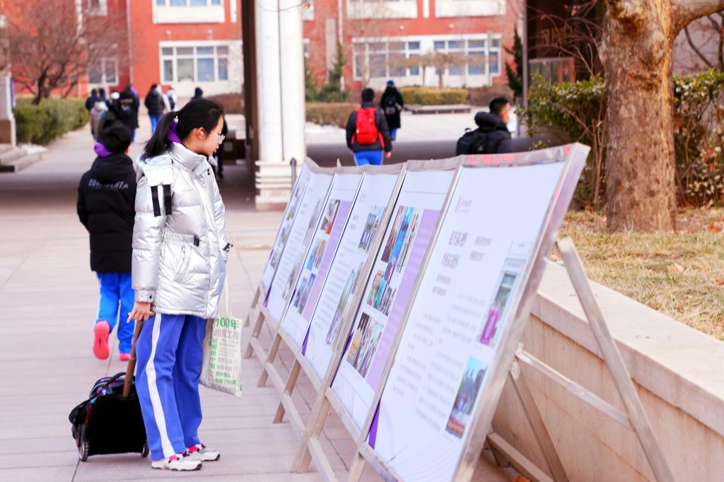 同学们在新学期宣传展板边驻足观看