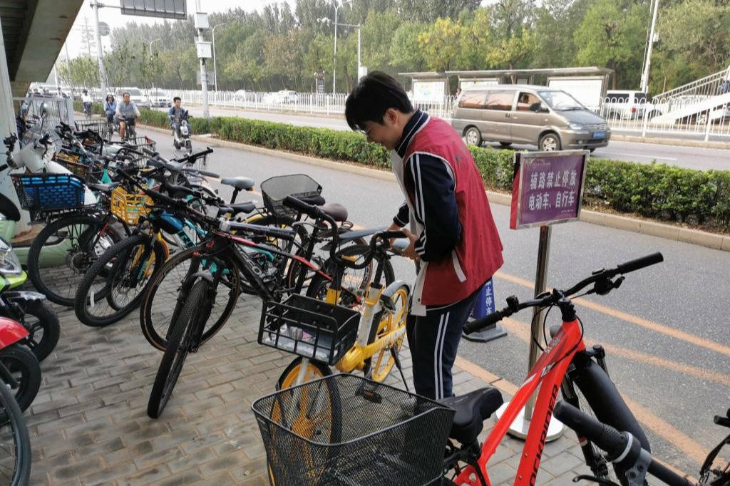 高二8班积极投身水木行动,码放校门口停车区域自行车