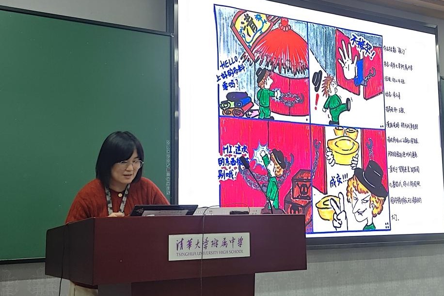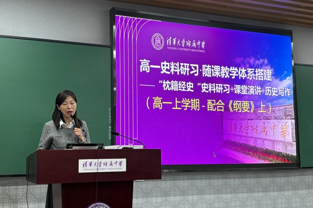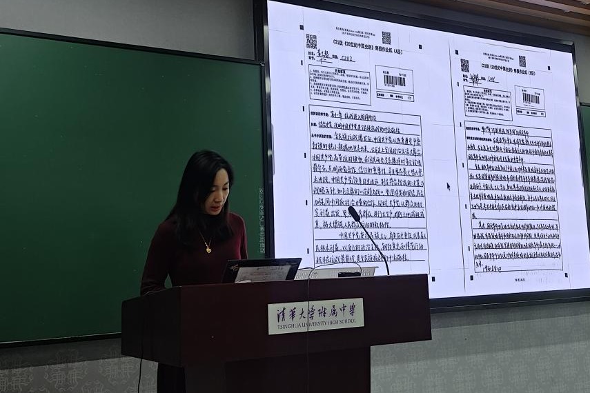 高一年级历史备课组长宋薇老师介绍“‘枕籍经史’学生史料研习教学活动”,学生在教师规定的十个题目中任选两个题目,阅读教师提供的学术论文后完成读后感写作。