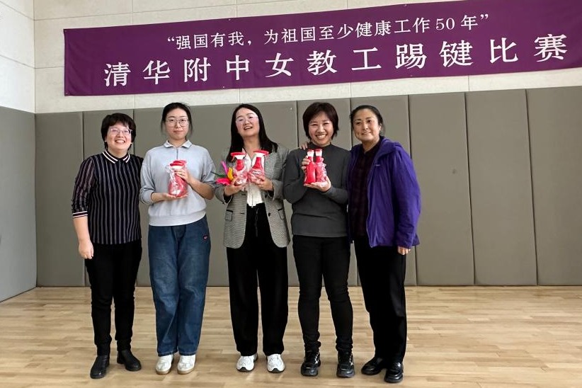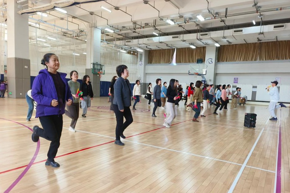 3月8日下午工会在体育馆一层开展了“强国有我,为祖国至少健康工作50年”女教工踢键比赛和健身操锻炼活动。女教师们热情参与。校长方妍、党委副书记兼工会主席张洁参加活动,并为获奖教师个人和获奖团体颁奖。
