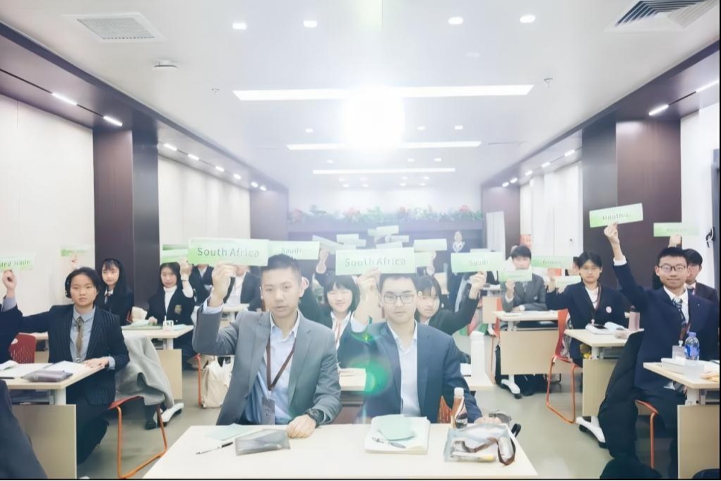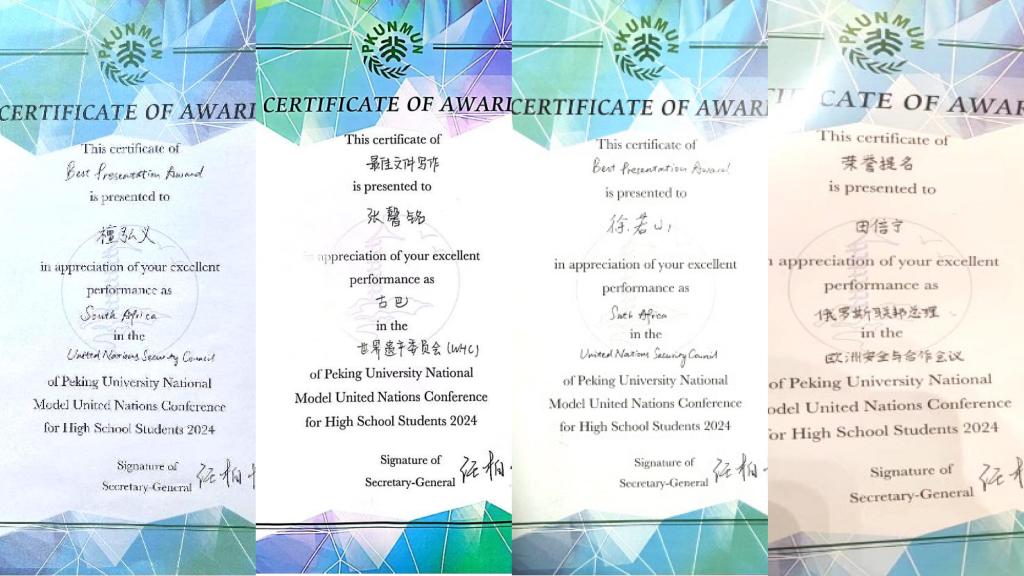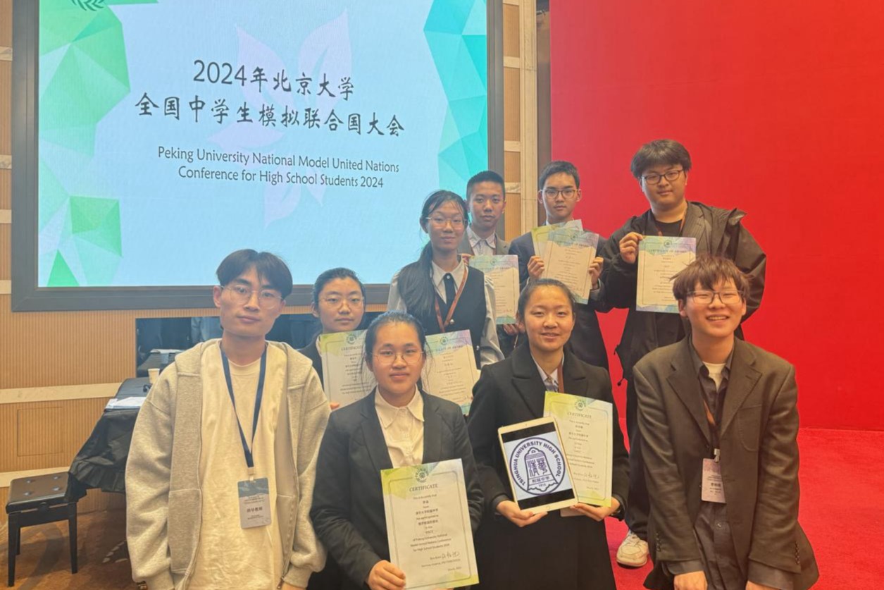 3月14日至17日,2024年北京大学全国中学生模拟联合国大会在北京大学顺利举办。在冯明老师的带领下,澳门网上博彩代表团的8位学生代表:高23级徐若山、张馨铭、钟诗雅、曹家宁、李涵、曹明朗、檀弘义与高22级田倍宁参加了北大模联为期4天的会议。