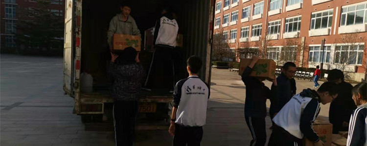 学生利用课间积极卸车,配合默契