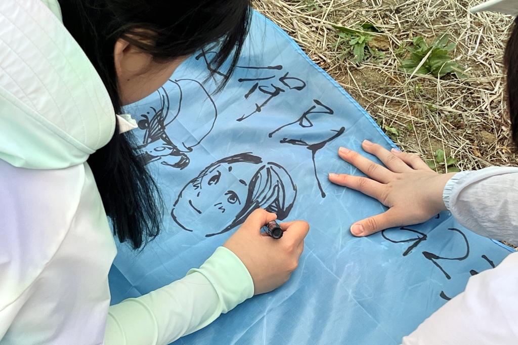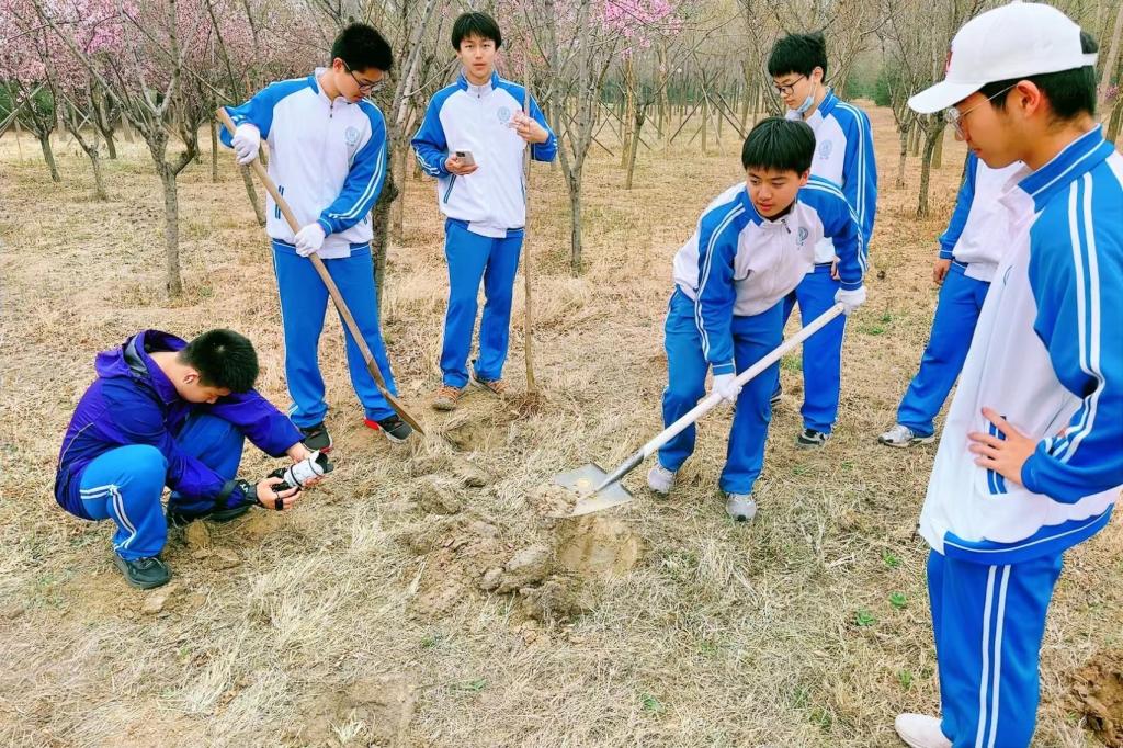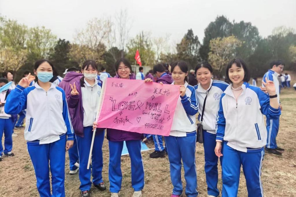 高2313班岳思齐:这是4月风和日丽、柳絮飘飞的一天,我们来到多山的怀柔放松身心。伴着铿锵的口号,同学们扛起一把把铁锹,扶正一棵棵树苗。经过“挖,种,埋,挖水圈”四道“工序”,光秃秃的土壤已然变成银杏树的海洋。大家纷纷把奇思妙想写在富有童趣的卡纸上,用绿丝带将其系在树枝。接着,在灰白色的天穹下,在墨绿色的湖水旁,在崎岖的棕黄色栈道上,我们开启了山环水绕的徒步之旅。此时,再次回到大巴车,同学们脸上都挂着汗珠与微笑。或许这就是本次活动的意义吧——感受短暂的,脱离天花板和作业的乐趣。