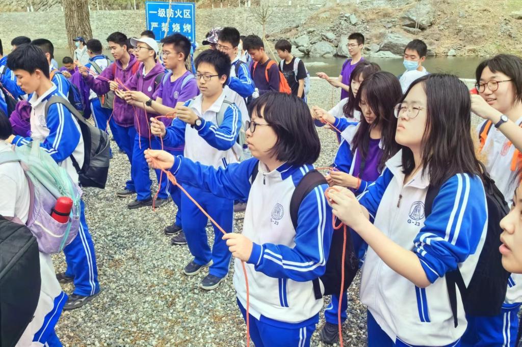 同学们在徒步中并利用休息时间学习打结