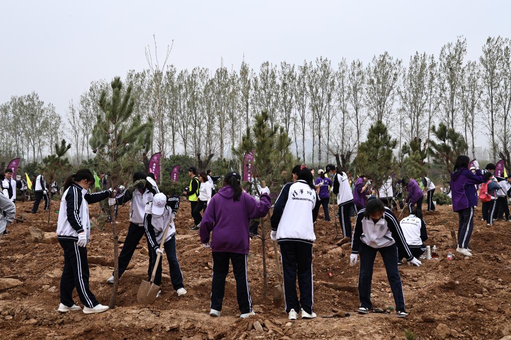 到达种植基地后,为保证树苗成活,同学们分工合作、认真地完成着经过培训后牢牢记在心中的植树流程。大家用铁铲在土地上谱写劳动的乐章,用清水浇灌美好的希望。