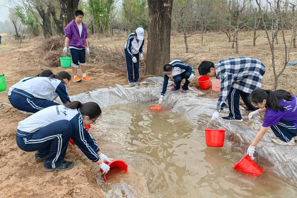 同学们在植树活动中团结互助,在打水环节中由于水位的下降而无法接满一桶,或陌生或熟悉的同学们毫不犹豫地借出空桶,用一个桶作为舀勺,填满彼此的水桶。