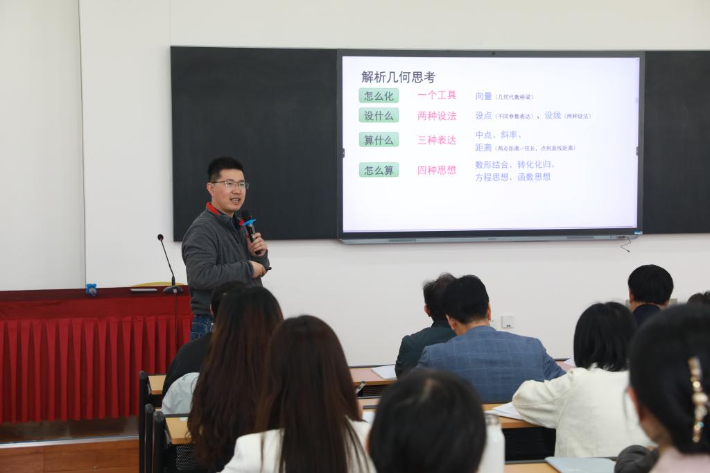齐亚超老师以《基于解析几何与导数的创新思维培养》为主题,从高考数学试题内容出发,通过重点分析新高考解析几何、导数、多项选择题型以及新定义压轴题等内容,与在座教师深入探讨高考题目精心设计的核心,并就培养学生创新思维等方面进行指导与分享。
