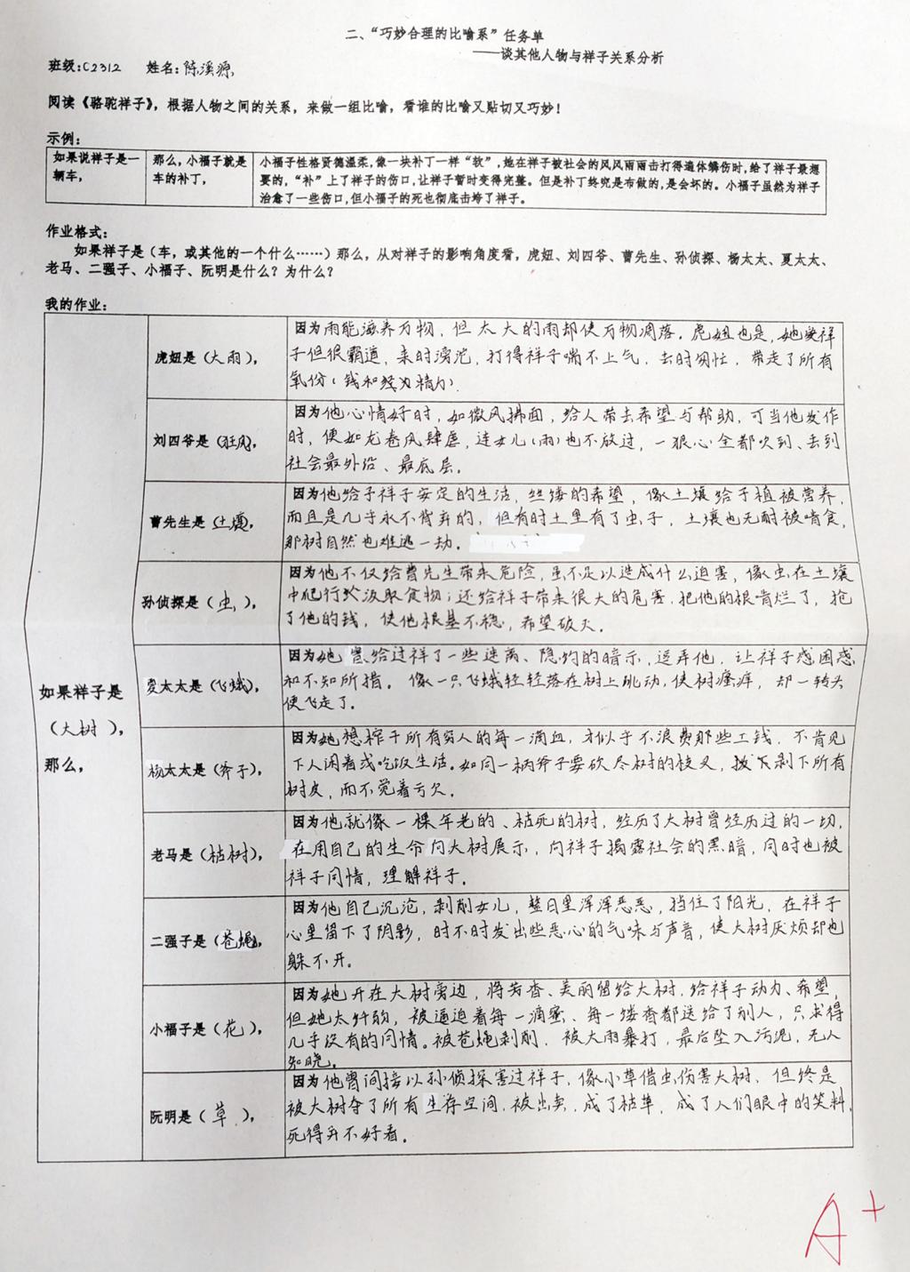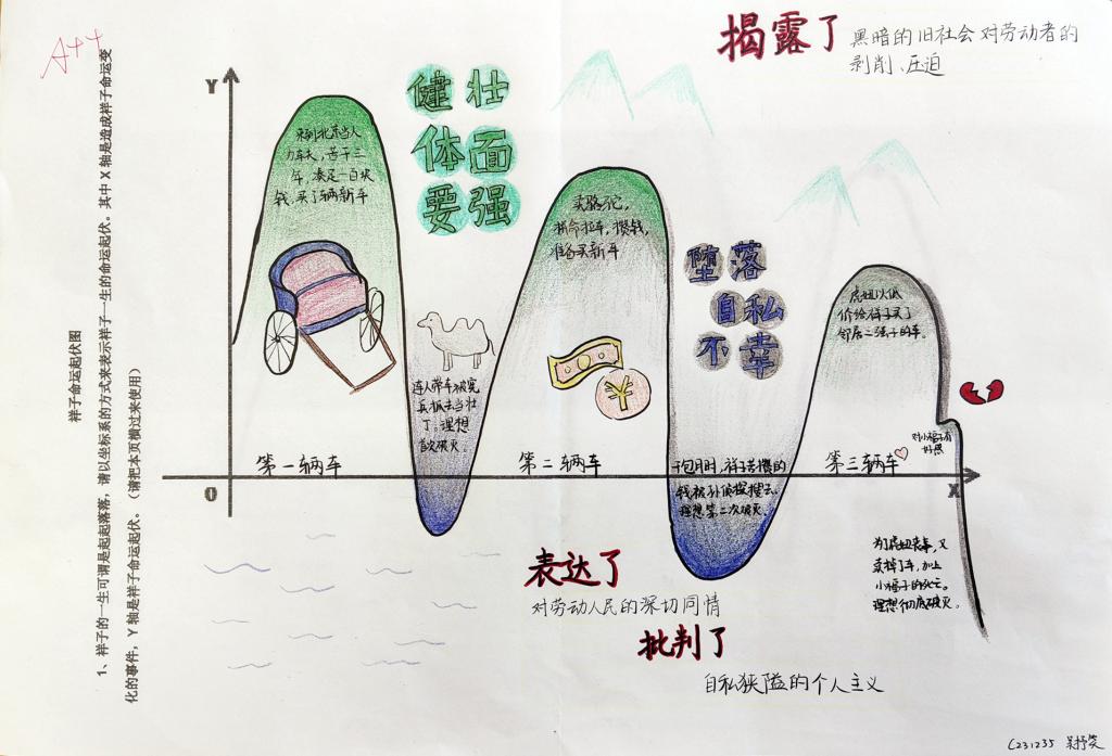 初一学部在读书季活动中,由语文备课组牵头开展《骆驼祥子》名著阅读趣味活动。为了激发同学们的阅读研究兴趣,初一学部语文老师们设计了相关趣味活动,比如围绕其他人物与祥子的关系,引导学生做一系列特色比喻;再比如围绕祥子起起落落的人生,请同学们以坐标系的方式标示祥子一生的命运起伏……这些构思新颖的名著阅读小活动,就像“祥子牵走三匹骆驼”一样,牵出了众多读书精品成果。