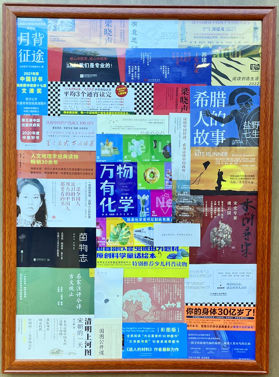 图书馆老师亲手设计,利用废弃的“腰封”制成图书馆特色装饰画
