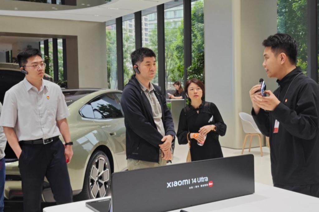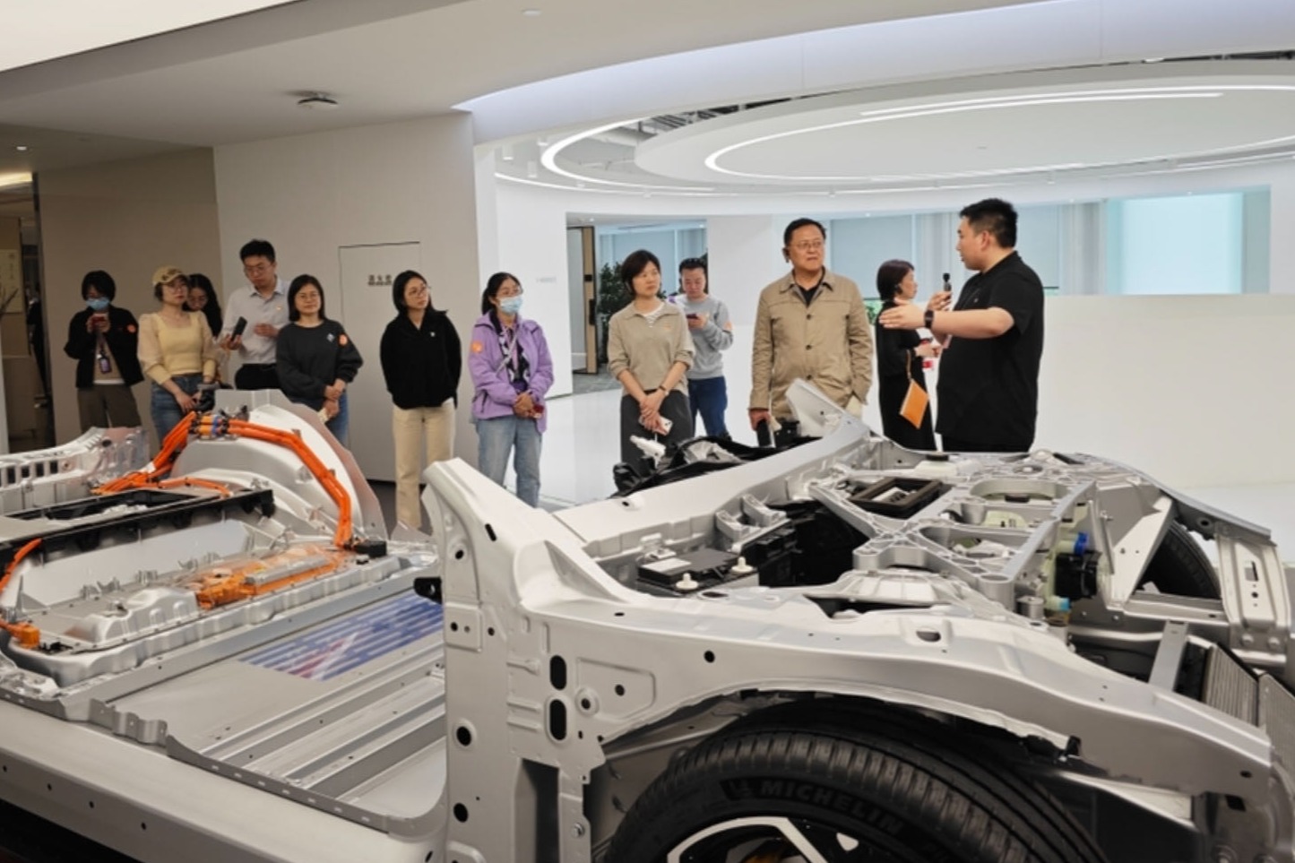 接着,党支部一行人跟随讲解员的脚步来到小米集团产品展厅,展厅分为两层结构,第一层展示小米汽车、手机和部分智能设备,二层展示智能家居、汽车的零部件等。在一楼,讲解员详细地向老师们介绍了车辆的各种参数和配件,并强调了小米汽车在设计上的创新理念和独特的外观设计,展现了小米汽车对于未来出行方式的前瞻性思考。