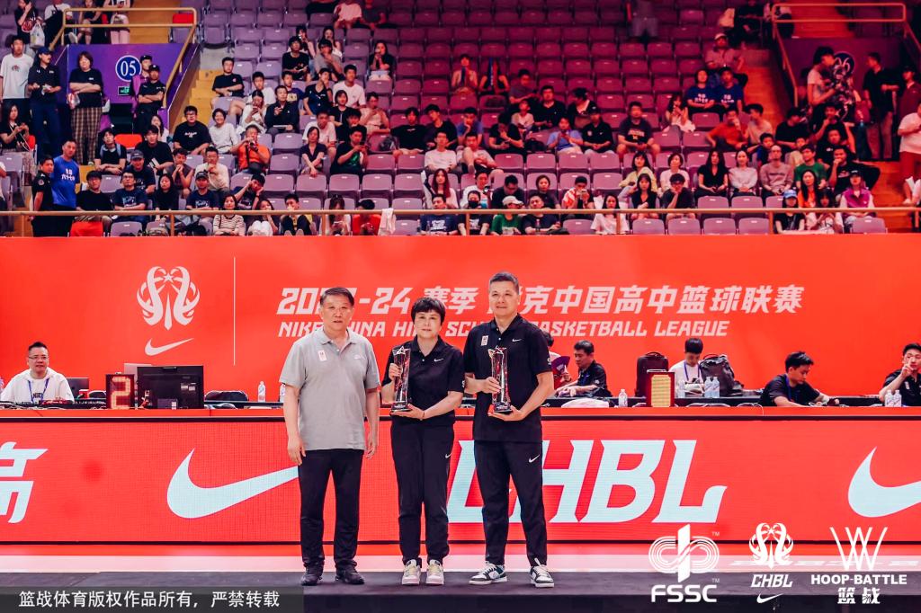 中国篮球协会副主席宫鲁鸣(左)与最佳教练王丽(中)合影