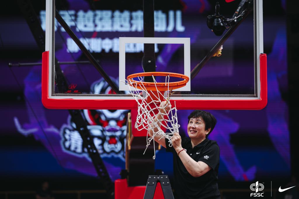 赛后,最佳教练王丽剪下篮网