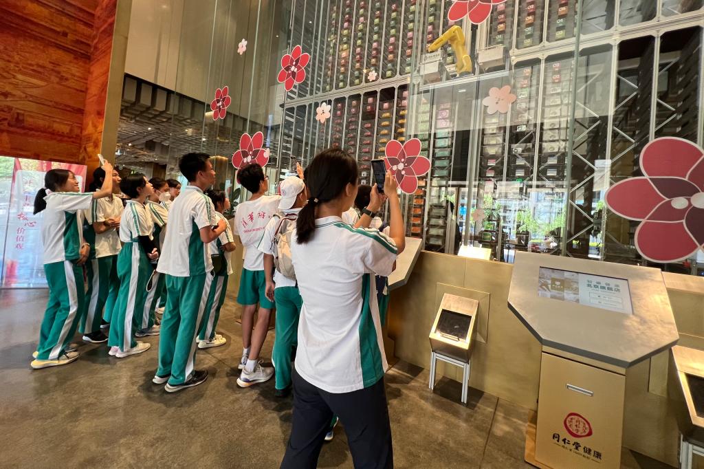 一入门,学生便被能够容纳9000多种商品的亚洲最大“24H不打烊”无人售药机深深吸引,感受到现代高科技与传统中药的融合。