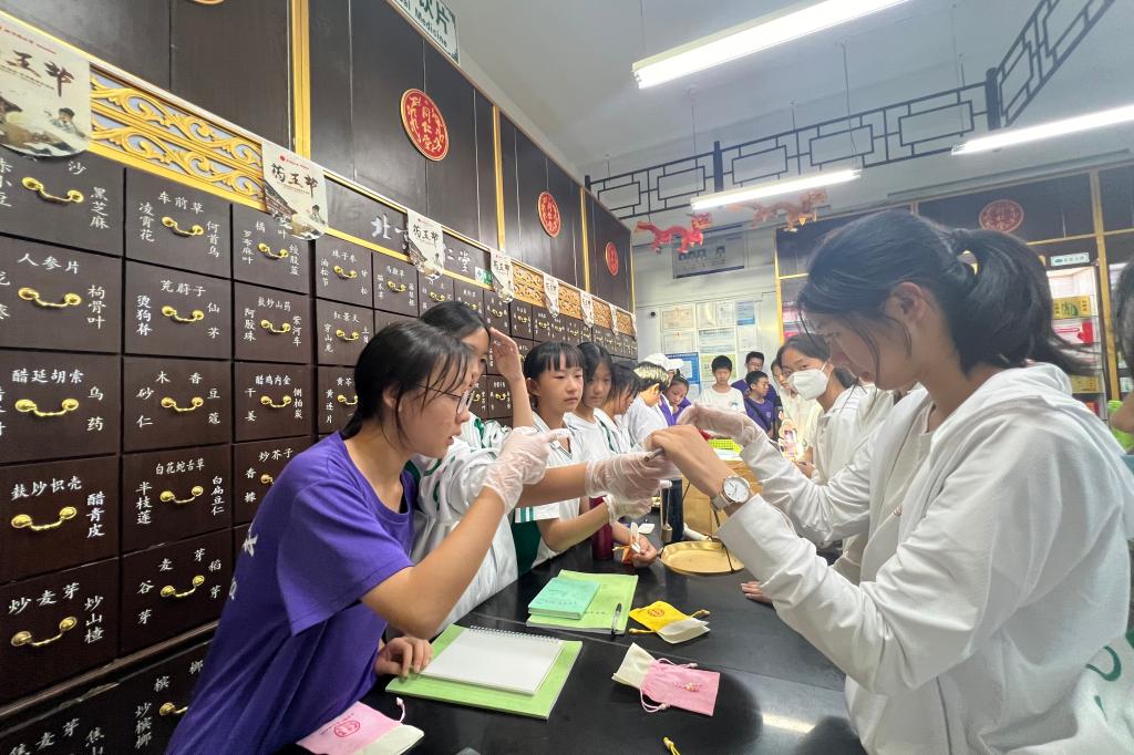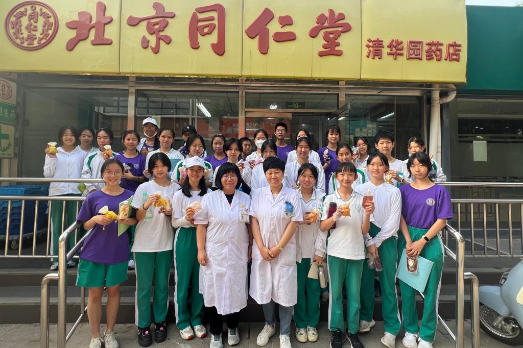 此前,学生还赴北京同仁堂药店(清华园店)采访调查。在药店,学生了解到同仁堂生产的不同类型中药,跟着店员识别药材,并亲手制作驱蚊香囊,感受到中药文化的博大精深。