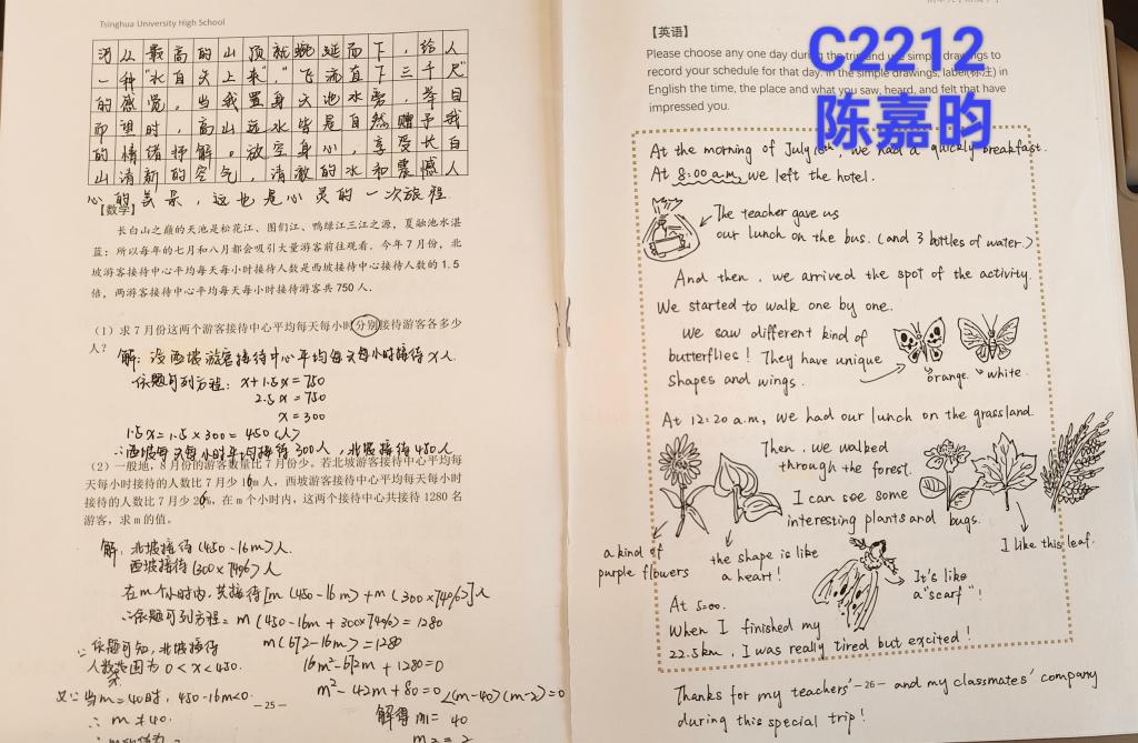 7月7日,我们初22学部新初三同学们一齐开启了6天的长白山研学之旅。我们在长白山天池前感受大自然的鬼斧神工;在浓雾之中探索前行的路;在原始森林中,行进22公里徒步,看到了小石潭记中所描述的“青树翠蔓,蒙络摇缀”,也感受到了“天山共色”之美。在长达6小时的徒步中,脚下的疼痛不断促使着我想要放弃,但“坚持”两字一直在脑中浮现,当通过终点的那一刻,手握奖牌,激动与兴奋充斥在心中。在整个研学旅行中,虽然累但也收获了自我的成长和对初三的憧憬。初三我们来啦!