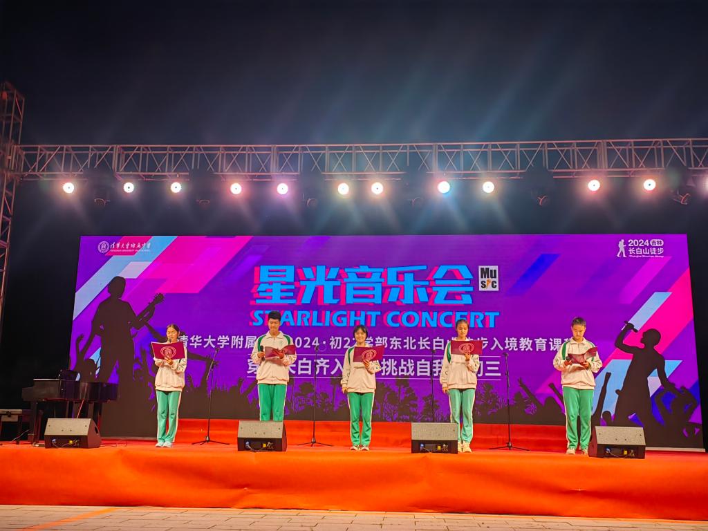 当夜幕降临,一场别开生面的星光音乐会拉开帷幕。班级合唱环节,各班学生用歌声传递心声,表达情感。个人节目更是带给大家重重惊喜——流行歌曲、舞蹈串烧,钢琴、小提琴合奏,英文音乐剧,歌曲独唱……在大自然的怀抱中,音符与星光交织,奏响了一曲曲动人的旋律。最后,当初三主题歌再次唱响,天空绽放出朵朵绚丽的烟花,为这次旅程增添了一抹浪漫的色彩。星光音乐会结束后,星空下的长白山又恢复了宁静。但师生们的心中激起的层层涟漪,永远不会散去。