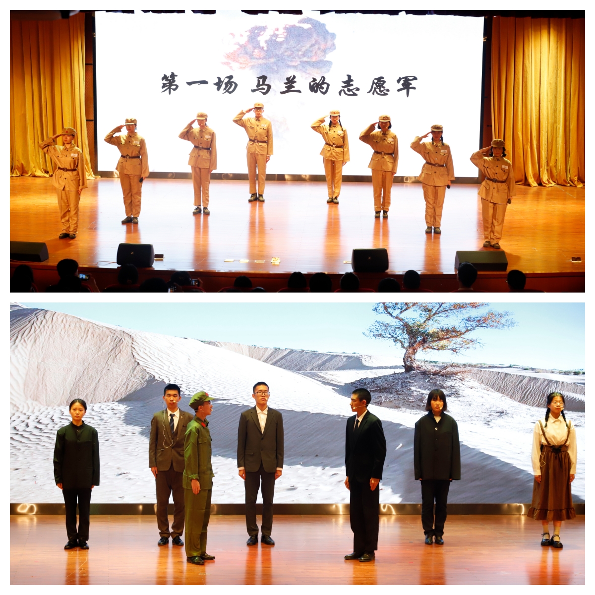 同学们排演的诗画剧《我愿以身许国》讲述了邓稼先、钱学森、任新民、王淦昌、钱三强和何泽慧为代表的一批优秀科学家,在祖国最需要的时候,毅然从国外回到祖国奉献自己,从无到有地创建我们的核工业。在嘉峪关市酒钢三中的首演,意义非凡,因为这里有中国核工业发展的摇篮——中核四0四公司。