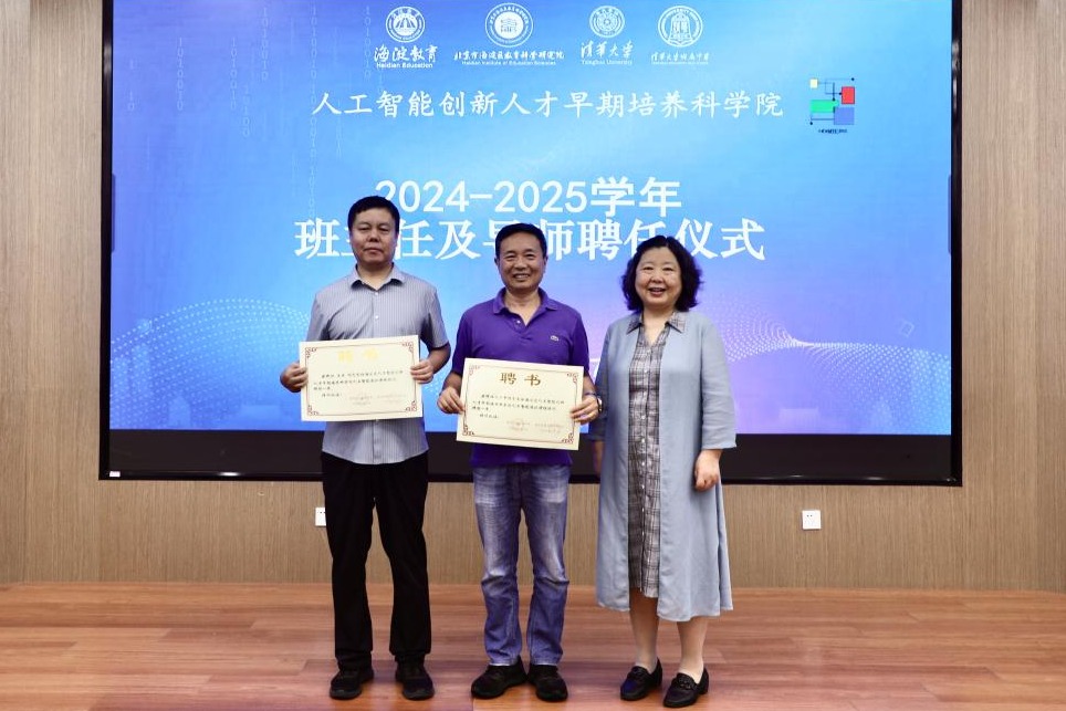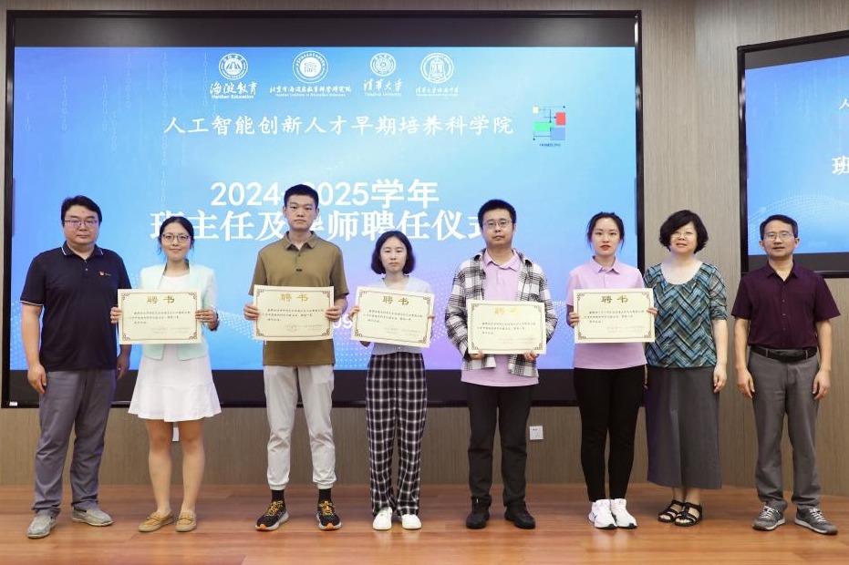 海淀区人工智能创新人才早期培养科学院聘请清华大学计算机系资深教授马少平、清华大学北京国家信息研究中心副研究员王东担任《人工智能通识课》课程顾问。现场还为“四字班”的学部主任、班主任、副班主任、导师“天团”颁发聘书。