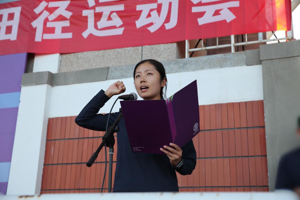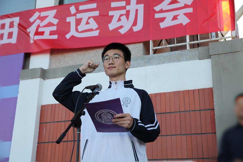G2215班彭天悦同学代表全体运动员宣誓,在运动会的各项比赛中,坚决服从裁判指挥;严格遵守竞赛规则;尊重对手;团结协作,勇于拼搏,超越自我,以“积极、饱满、热情”的态度参加各项比赛,弘扬体育精神。