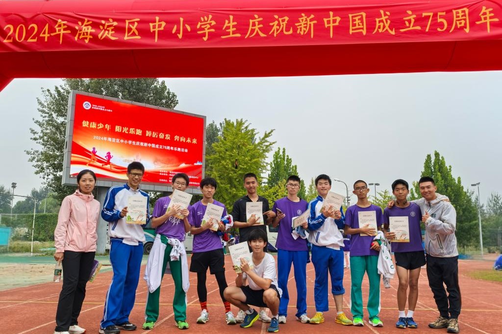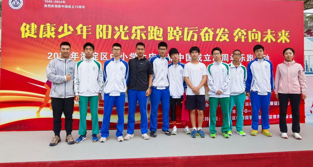 9月28日,海淀区教委组织开展海淀区中小学生庆祝新中国成立75周年乐跑活动。在学校指导下,澳门网上博彩校男子田径队初三(7)刘昭鹭、高二(16)简耀远、初三(3)樊懿轩、高二(17)籍祥瑀、初三(15)王俊皓、高二(12)陶墨、初三(17)周力扬、高二(17)杨潇、高二(16)谭乐然9名学生在付帅老师和刘珣老师的带领下参与其中。