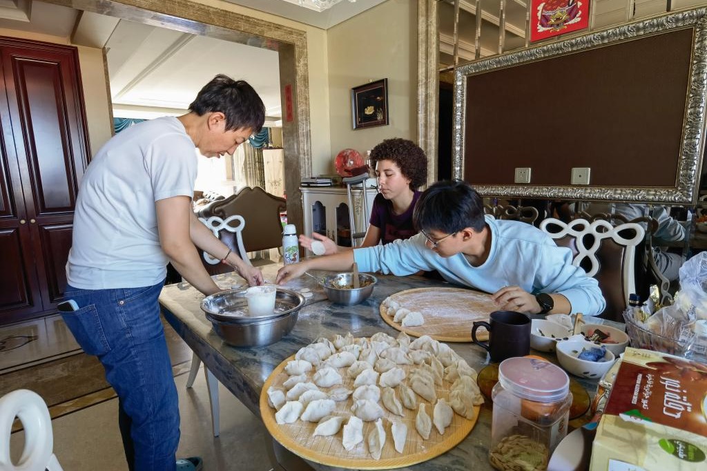 汪璐涵与伙伴Orlando Ada一起包饺子