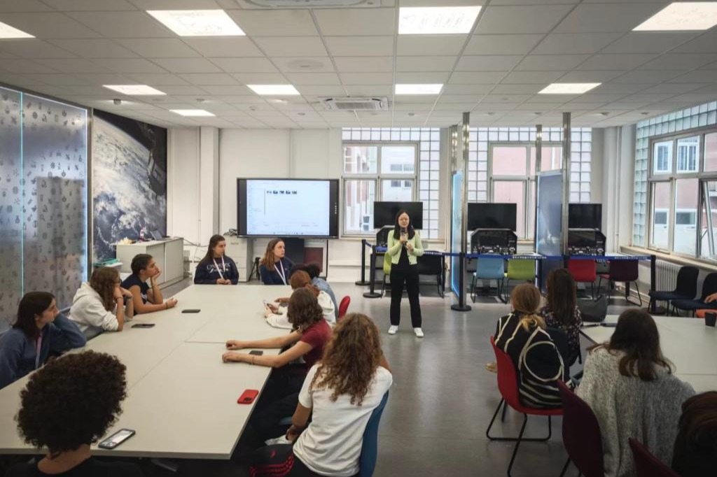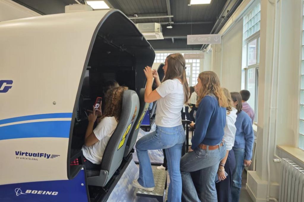 居重艳老师(中)为意大利师生介绍波音牛顿飞行学院