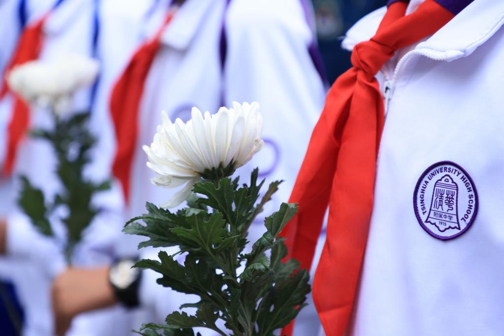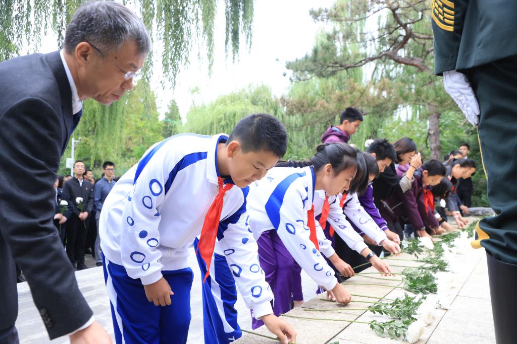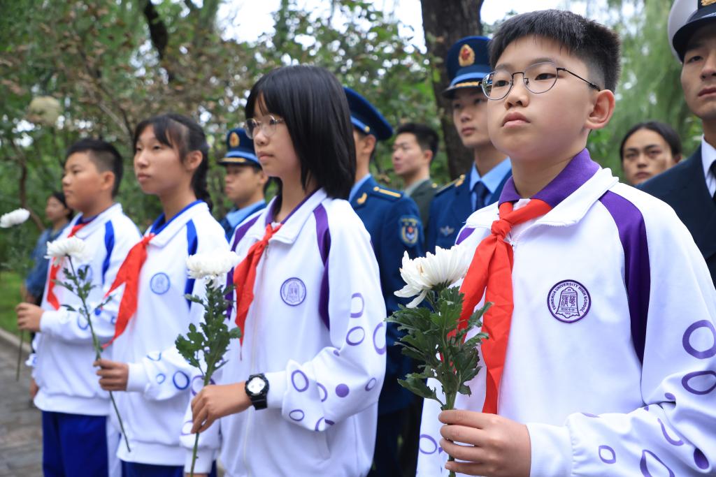 澳门博彩在线学生代表手持白菊缅怀英烈