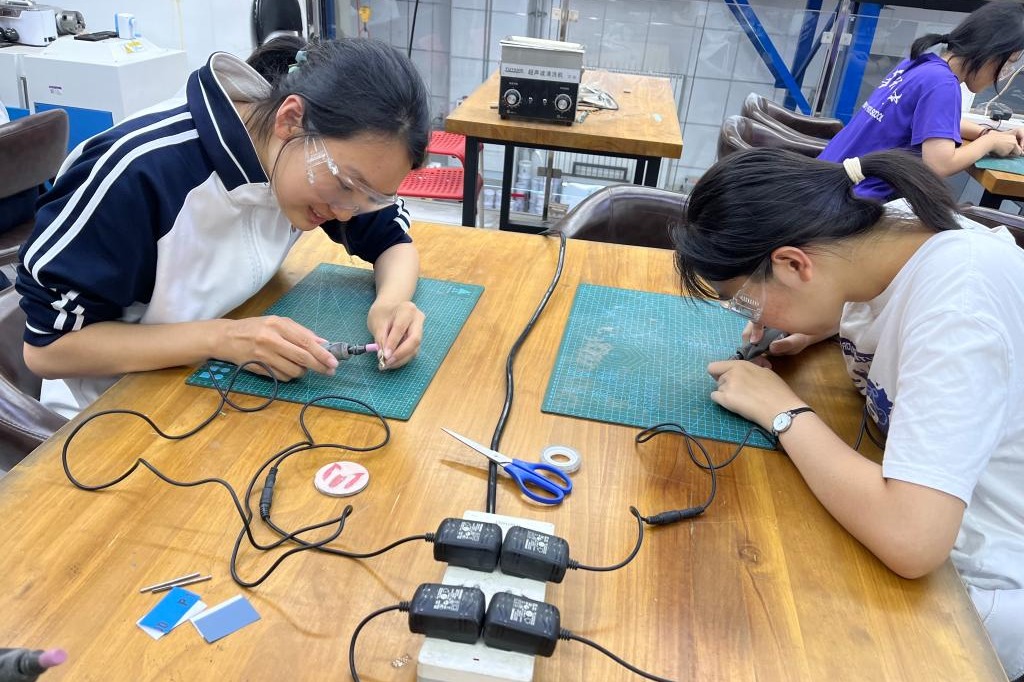 高2215班同学走进清华大学基础工业训练中心,亲手体验了亚克力流光灯和银杏叶制作。
