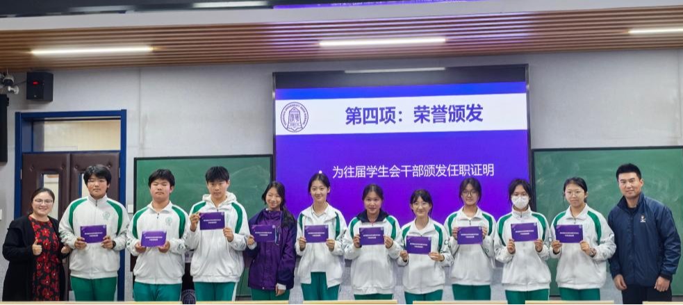 会议中也为初三往届学生会主席团和部长们颁发了任职证明、肯定了他们的付出并且希望为学生会的发展继续做出努力和建议。
