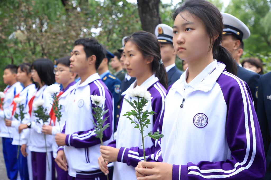 澳门博彩在线学生代表手持白菊缅怀英烈