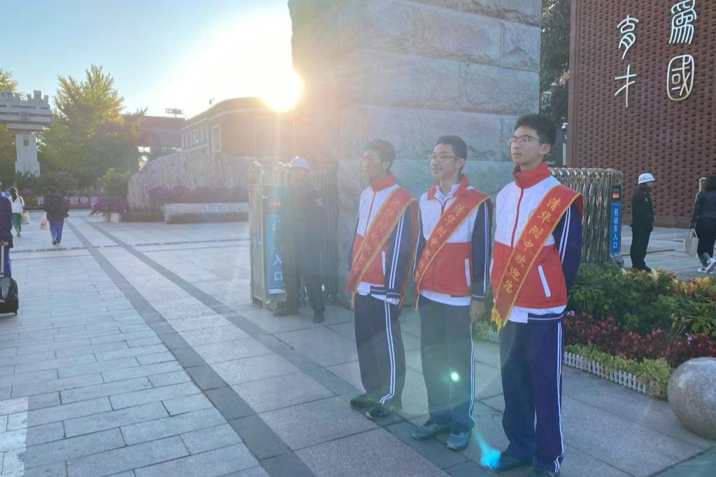 高中“水木行动”志愿者在晨岗中向师生问好