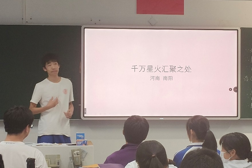 高2309班在爱国爱校主题系列班会课中,对暑期支教活动做了汇报分享。参与支教的学生之一张睿宸同学在分享结束后郑重说到:“我想,每一个人都是社会里坚实的力量、八九点钟的太阳,是充盈大地、万物生光辉的温暖。希望大家关注到南阳救灾、教育发展,以及全国上下可以帮助到的地方,为他们,也为自己,将人生投入到社会志愿中去,收获到的,是千金也买不到的难忘体验。”
