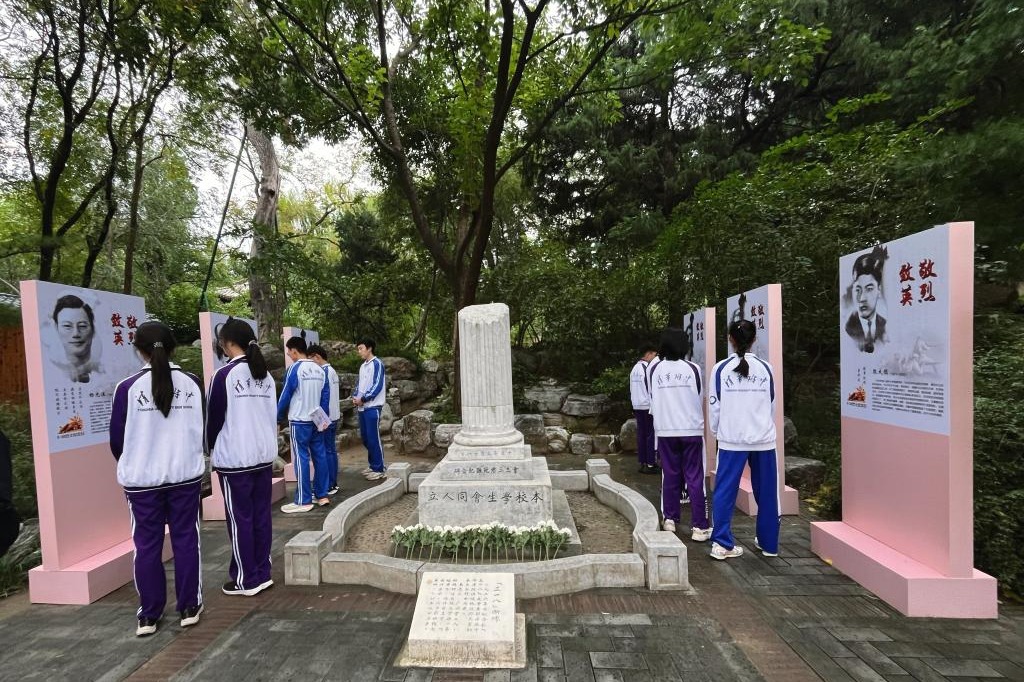 附中学生代表在“三一八”断碑前参观英烈事迹