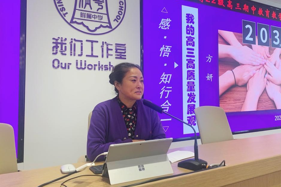 尹粉玉老师以"精准施策,强基提质"为题对高三学部期中前整体教学情况进行分析总结并对后一阶段工作提出了建议。希望高三教师在班级工作组的领军人物班主任以及学科组的领军人物备课组长的带领下精研深耕。借助模拟测试结果,对标高考,发现学生在“学科素养、关键能力、必备知识”上的优势和不足,从学年角度,系统地考虑本次模拟测试的价值,并采取分类措施;以问题为导向,以高品质常态课为核心提升备考质量。她也希望老师们能够激发每一个学生的学习动力,并通过陪伴与学生同行,给学生提供强大的后盾。